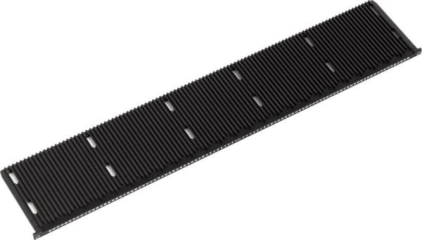 The image shows a black, long object with many closely spaced, parallel grooves. It has fastening elements at both ends and resembles a heatsink or a type of ventilation element.