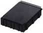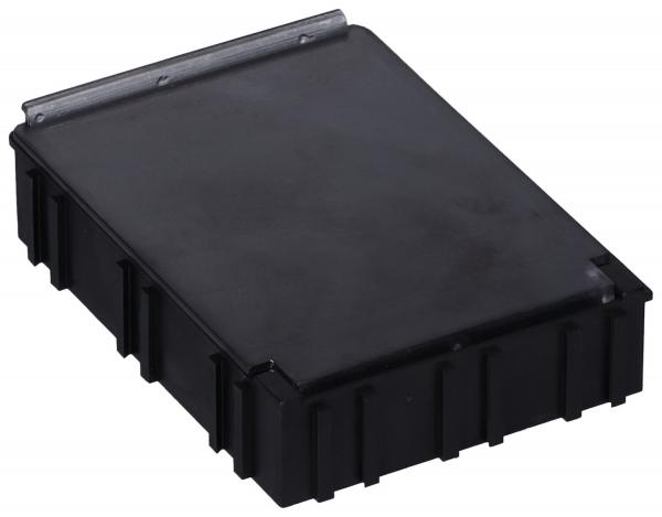 Preview: The image shows a rectangular, flat box made of black plastic. It has a smooth top and side grooves or indentations that give it structure.