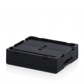 Preview: The image shows a black plastic box with a lid. It has a red carrying handle, a textured front, and is sturdy. The box is rectangular and can be used for transport.