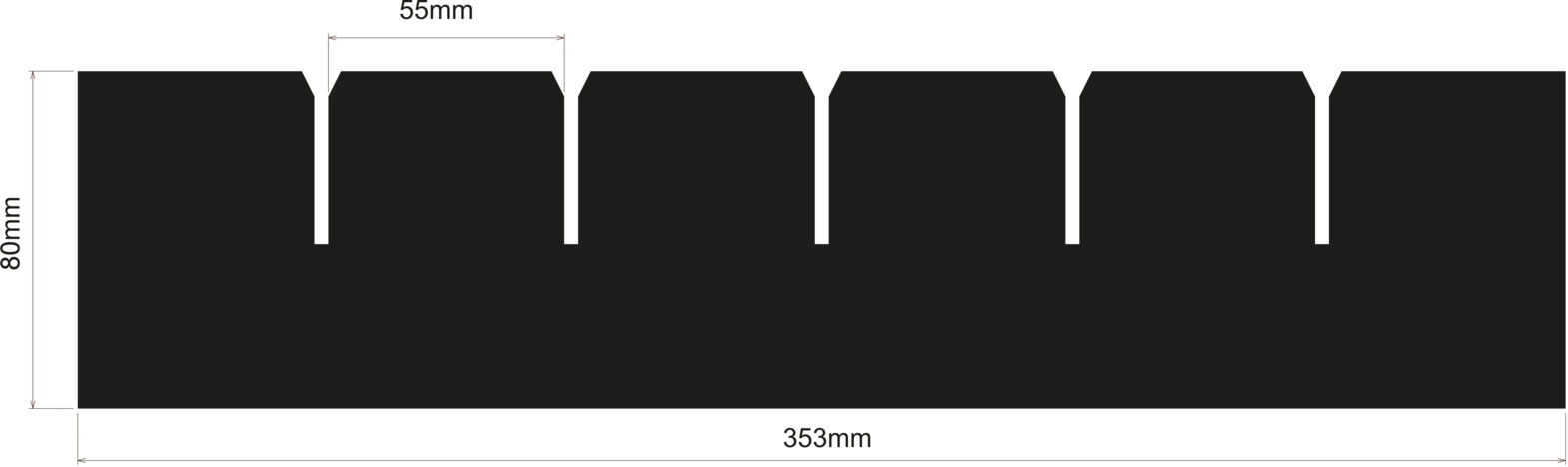 The image displays a black area measuring 353 mm in width and 80 mm in height. At the top, there are five evenly distributed rectangular cutouts.