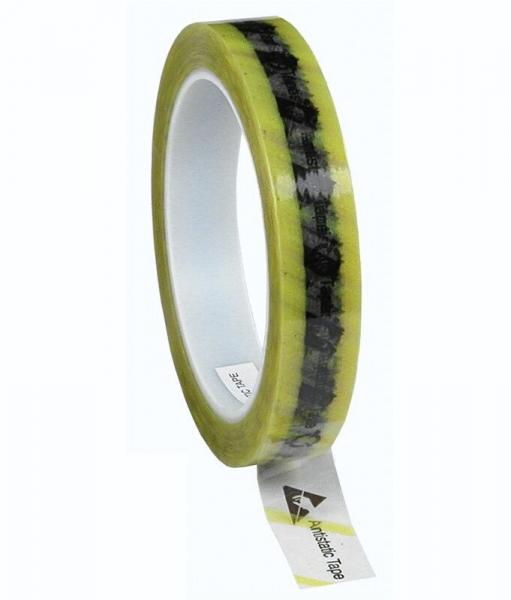 The image shows a roll of tape. The outside is bright yellow with a black, irregular pattern. The inside is white and the roll has a label with a logo.