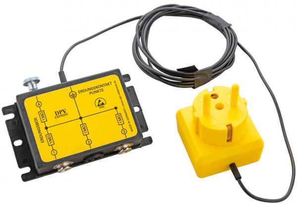 Grounding box with 4 laterally mounted ports, as a central grounding reference point, mounting plates, grounding wire 2.5 m, plugs with plastic holding pins