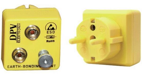 Preview: The image shows a yellow electronic device with two round sockets and a screw. It is used for grounding and has the labels "DPV Elektronik" and "ESD".