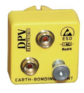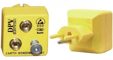 Preview: The image shows a yellow electronic device with two round sockets and a screw. It is used for grounding and has the labels "DPV Elektronik" and "ESD".
