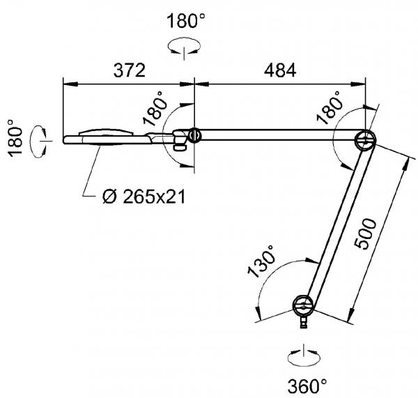 Preview: The image displays a technical drawing of a lamp with various rotation and swivel ranges. Dimensions and angles for the mobility of the arms are provided.