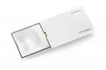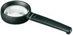 The image shows a black magnifying glass with a rectangular lens and a round auxiliary window. The handle is ergonomically designed, and there are two buttons at the lower end.