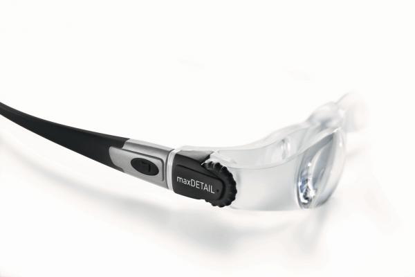 Preview: The image shows a pair of glasses with transparent lenses. On one temple, there is a black control panel with a button and a dial for adjustment.