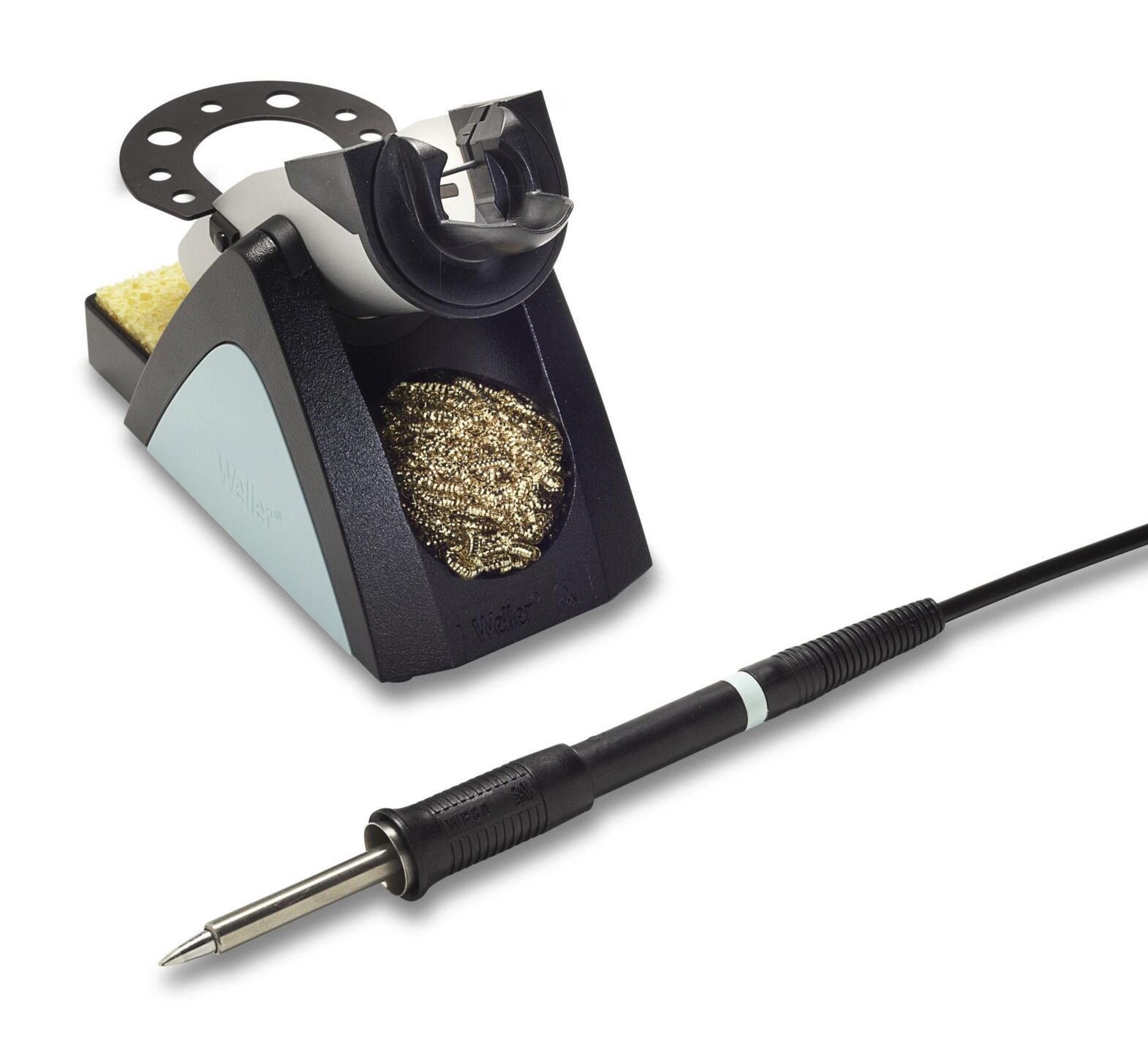 The image shows a soldering station with a semi-circular stand for a soldering iron. It is placed next to a cleaning spiral and a sponge for cleaning the soldering tip.