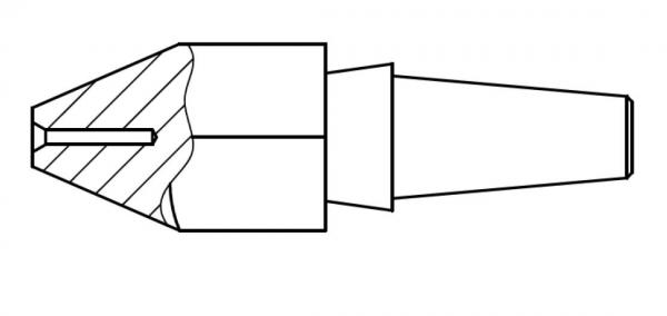 The image displays a drawing of a fountain pen nib. It has a conical shape with a small groove in the middle, which extends into a longer shaft.
