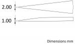 The image shows two conical shapes, one with a height of 2 mm and the other of 1 mm. The upper shape is wider and tapers towards the end. Dimensions are provided on the right.