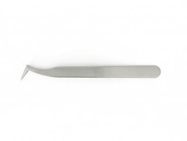The image shows a curved, metallic tweezer. It has a flat, wide gripping area and a pointed, slightly curved working surface at one end.