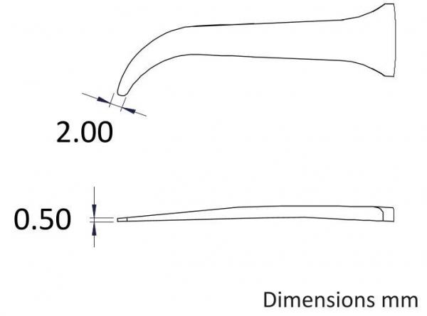 The image displays a technical drawing of an object with two dimensions: 2.00 mm and 0.50 mm. It features a curved and a straight shape, with clear lines and measurements.