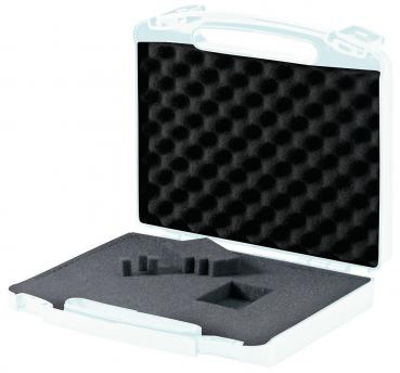 The image shows a white holder with two horizontal shelves. It has several holes and a sturdy, rectangular shape. Ideal for storing tools or equipment.