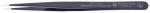 The image shows a black tweezer with long, pointed ends. It has a matte finish and is made of stainless steel. Information about the material is embossed on the side.