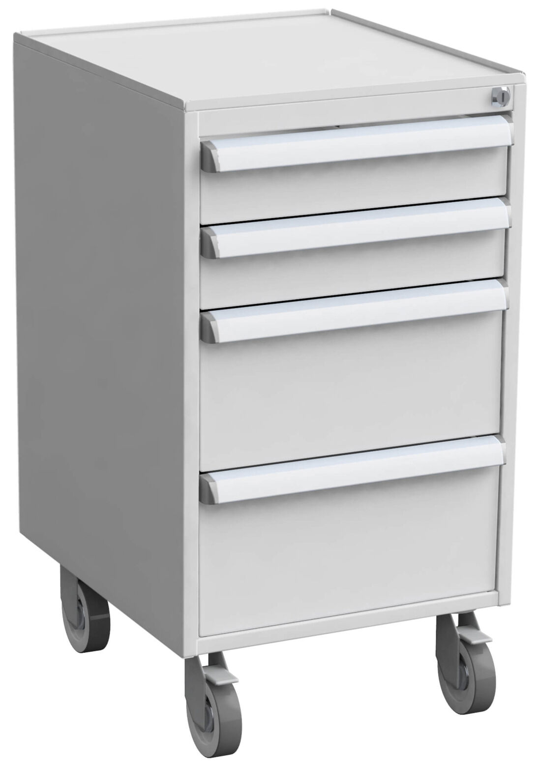 Vielseitiger, abschließbarer Schubladenblock mit hellgrauen Schubladen (RAL 7035). Schubladenblöcke mit Sockel, auf Rollen oder als Standardausführung zur Montage unter der Arbeitsplatte. Die mit Rollen ausgestatten Schubladenblöcke können als Werkzeugwagen und zusätzliche mobile Arbeitsfläche genutzt werden. Die Modelle sind mit ESD-Schutz ausgerüstet, weshalb sie gut für den Einsatz in ESD-Schutzbereichen (EPAs) geeignet sind.