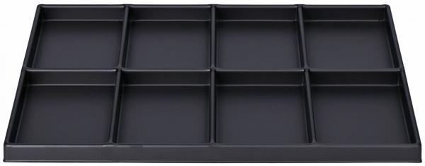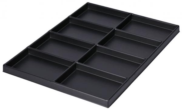 Das Bild zeigt ein schwarzes Ablagenfach mit neun Rechteckabteilungen. Es hat einen flachen Boden und die Wände sind leicht erhöht, sodass die Fächer gut voneinander getrennt sind.