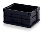 Das Bild zeigt eine schwarze Kunststoffkiste. Sie ist rechteckig mit offenen Seiten und hat strukturelle Verstärkungen. Die Kante ist leicht erhöht, wodurch sie stabil wirkt.