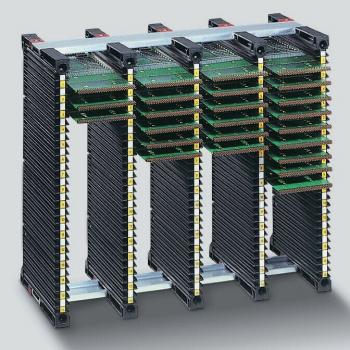 Die Stegwände sind auf den Profilschienen einstellbar. In die äußeren Justagenuten werden zwei Leiterplatten eingesetzt.