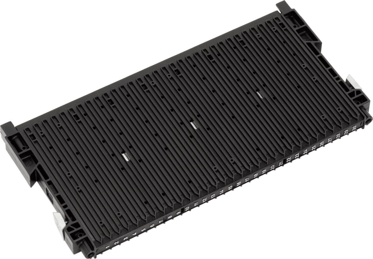 Das Bild zeigt eine schwarze, rechteckige Komponente, die flach und länglich ist. Sie hat mehrere parallele Rillen und an den Seiten befinden sich Clips oder Halterungen zur Befestigung.