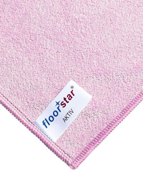 Das Bild zeigt ein pinkes Mikrofasertuch mit einer feinen, weichen Struktur. An der Ecke ist ein Etikett angebracht, das die Marke "floorstar" und die Bezeichnung "AKTIV" enthält.