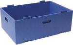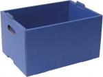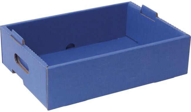 Das Bild zeigt eine rechteckige, flache Box aus stabiler Pappe, in einem kräftigen Blau. Sie hat kurze Seitenwände und zwei seitliche Griffe zum Tragen.
