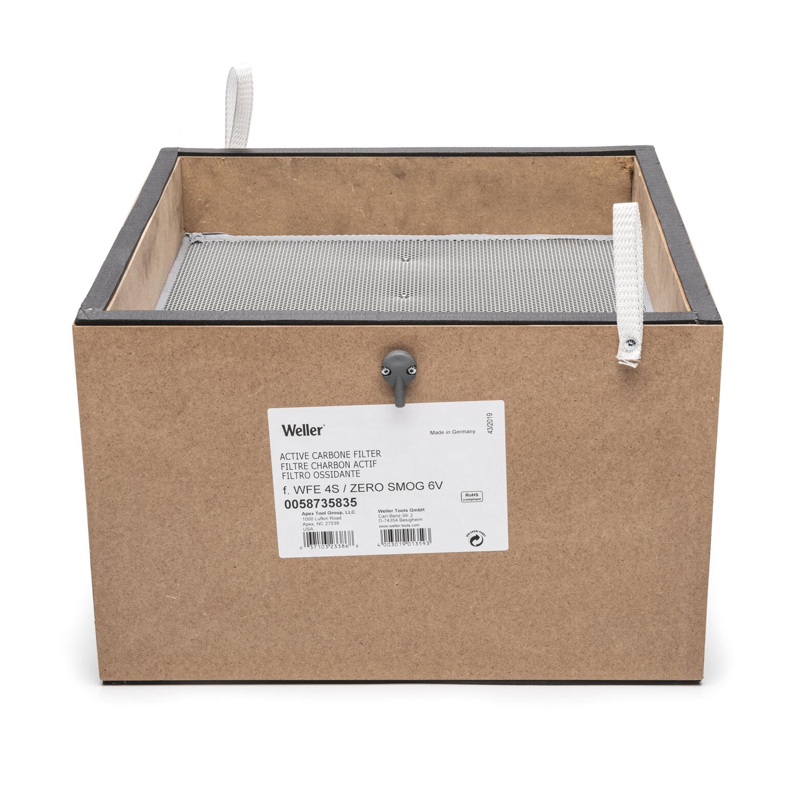 Das Bild zeigt einen quadratischen, braunen Karton mit einem feinen Gitter an der Oberseite. Auf der Vorderseite befindet sich ein Etikett mit Informationen und einem kleinen Griff.