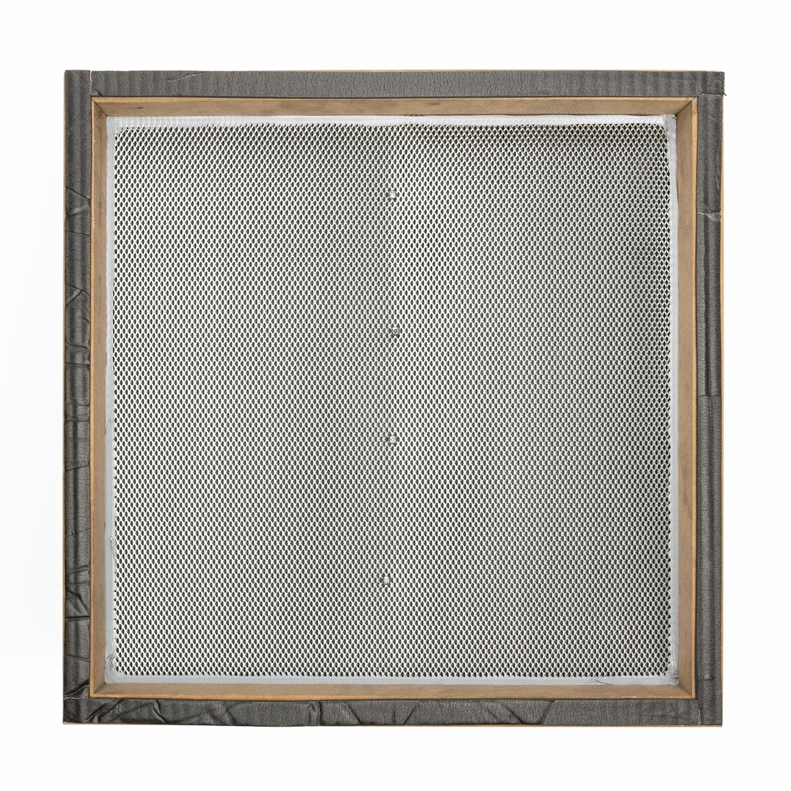 Das Bild zeigt einen quadratischen Rahmen aus Holz und Metall. Die Innenseite ist mit einem feinen, schwarzen Netz gewebt, das kleine Öffnungen aufweist. Der Rahmen wirkt robust.