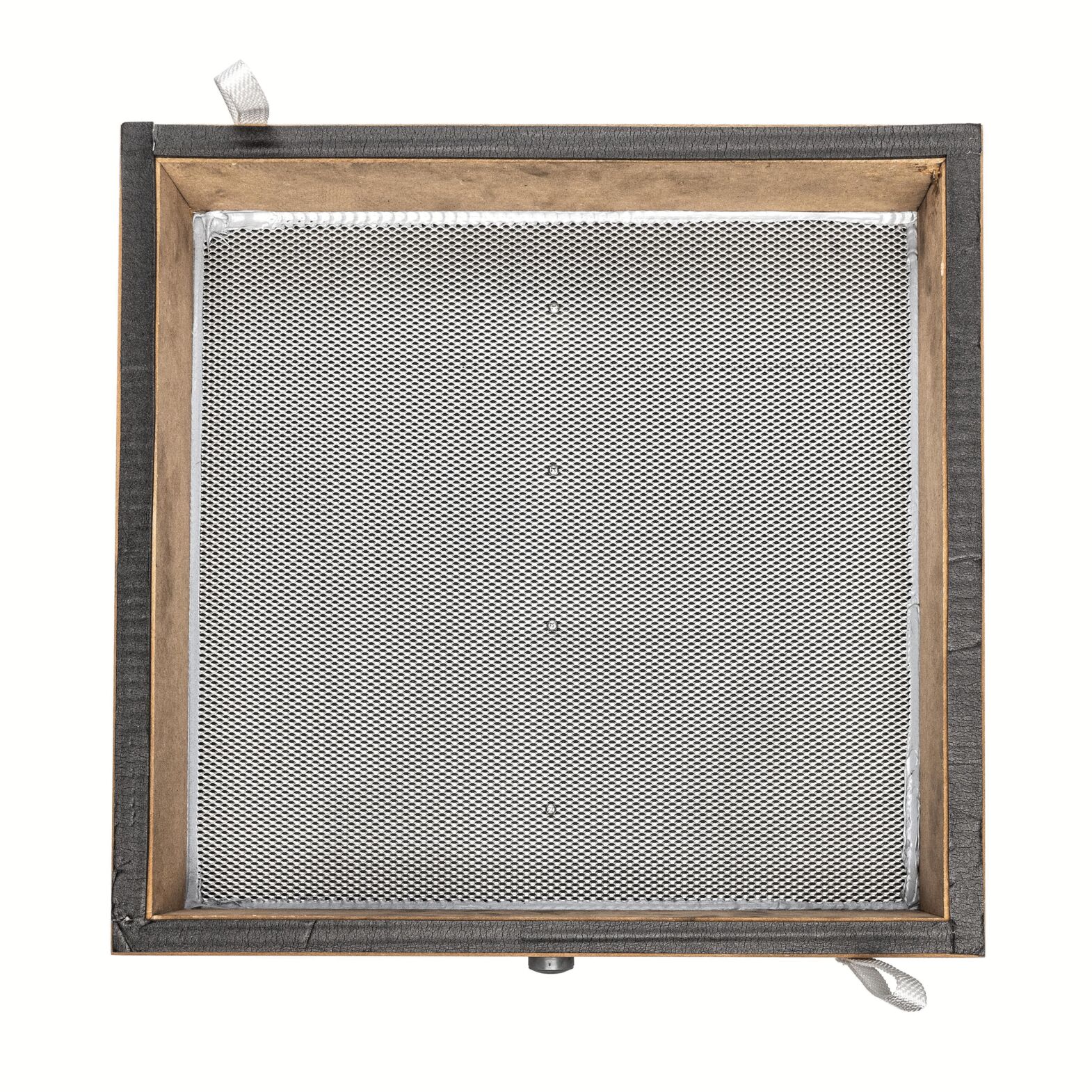 Das Bild zeigt einen quadratischen Holzrahmen mit einem feinen, grauen Metallgitter in der Mitte. Der Rahmen hat eine einfache, rustikale Ausführung. An einer Seite ist ein kleines Band angebracht.
