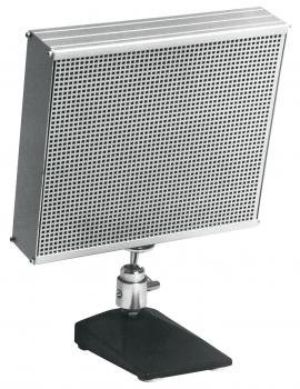 Das Bild zeigt einen Lautsprecher mit quadratischer Front aus Metallgitter. Er steht auf einer stabilen schwarzen Basis und hat einen verstellbaren Halter, der ihn in verschiedene Positionen bringen kann.