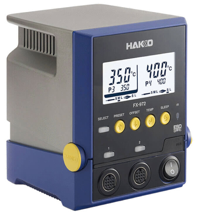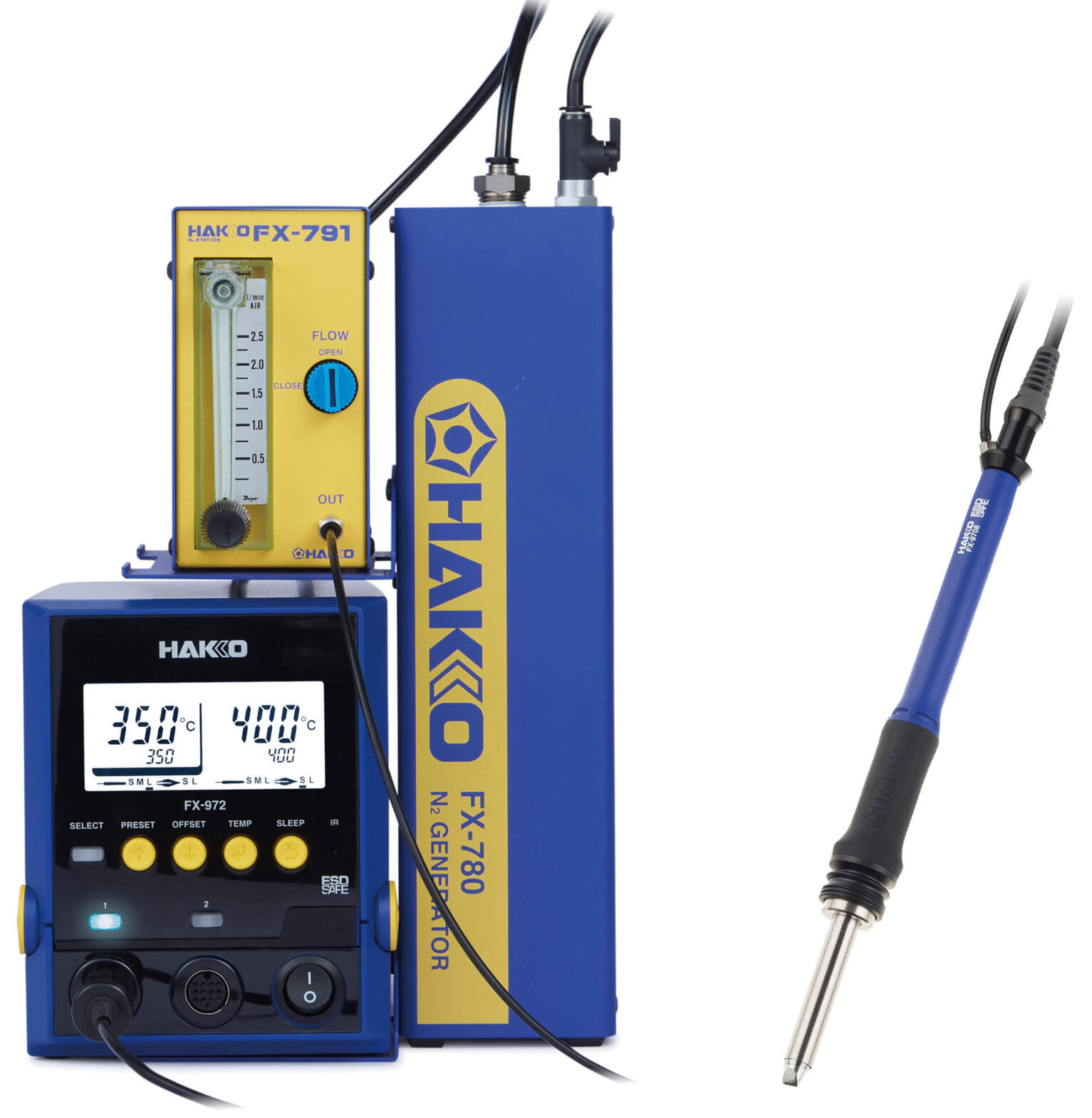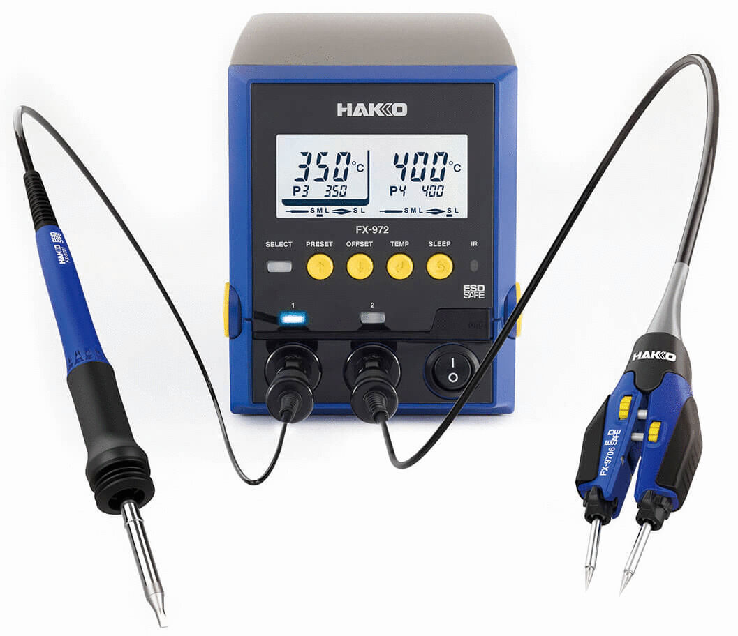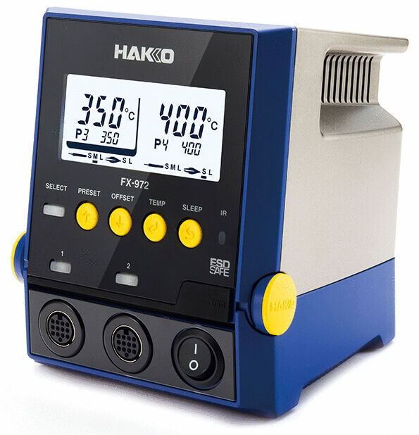 Die Hakko-Lötstationen FX-971 (100 W) und FX-972 (200 W) bieten ergonomisches Design, extrem schnelle Reaktionszeiten und leistungsstarke Aktiv-Lötspitzen. Mit Auto-Sleep, Abschaltfunktion und N₂-Unterstützung sind sie energieeffizient und langlebig – ideal für Reparaturen von feinen bis massereichen Lötstellen.