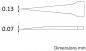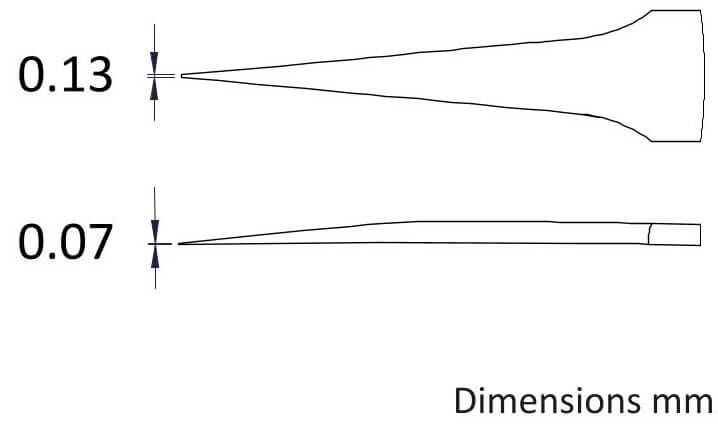 Preview: Das Bild zeigt zwei spitze Formen, die unterschiedliche Durchmesser haben: oben 0,13 mm und unten 0,07 mm. Beide Formen sind schematisch und nebeneinander angeordnet.