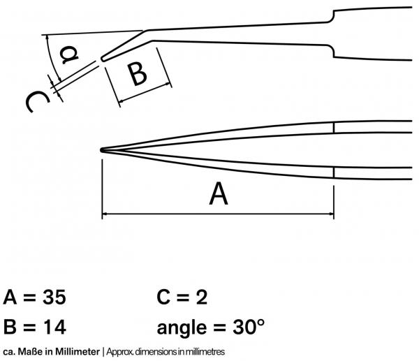 Das Bild zeigt eine skizzierte Zange mit verschiedenen Abmessungen: A = 35 mm, B = 14 mm, C = 2 mm und einem Winkel von 30°. Maße sind beschriftet, um Klarheit zu schaffen.