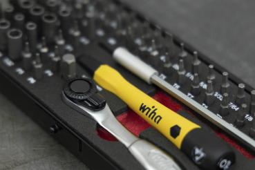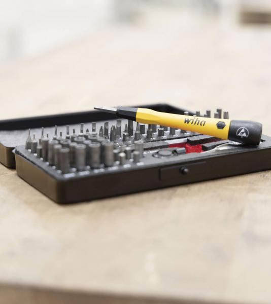 Das 65-teilige MicroBit-Set von Wiha ist speziell für den Einsatz in Bereichen der Elektronik und Feinmechanik konzipiert, wo Präzision und Schutz kleiner Schraubverbindungen essentiell sind. Das Set beinhaltet eine Vielzahl von Bits in gängigen Profilgrößen für diverse feine Schraubarbeiten, sicher aufbewahrt in einer robusten, kompakten Box. Der enthaltene ESD Feinschraub-Griff entspricht der internationalen Norm IEC 61340-5-1 und bietet durch seinen Oberflächenwiderstand von 10^6 - 10^9 Ohm einen effektiven Schutz gegen elektrostatische Entladungen. Zusätzlich ermöglicht die mitgelieferte Bit-Ratsche mit einem Schaltwinkel von nur 5° kraftvolles, jedoch präzises Arbeiten auch in beengten Räumen. Das Set umfasst diverse Bit-Größen und Typen, darunter Philips, Schlitz, Sechskant, TORX® und Pentalobe, sowie passende Steckschlüssel und Adapter, die eine breite Anwendungspalette abdecken.