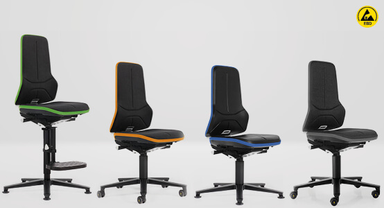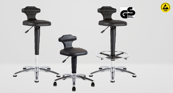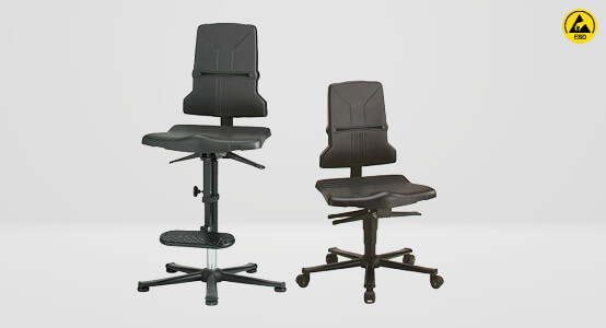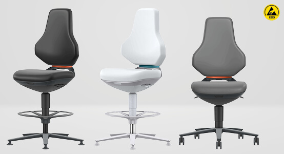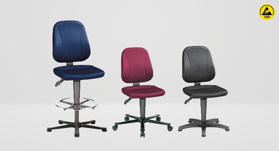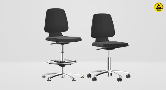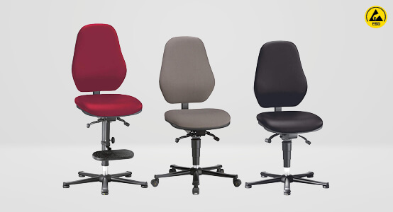 Die ESD-konformen Arbeitsstühle von Bimos sorgen für einen Rundumschutz: Durch leitfähige Komfortpolster, leitfähig beschichtete Stahlteile, volumenleitfähige Kunststoffe, Rollen und Gleiter sowie eine bauteilübergreifende Ableitung bilden die Arbeitsstühle ein zuverlässiges Gesamtsystem. Dieses erfüllt nicht nur die gängigen Normen, sondern wird auch den hohen Anforderungen der Praxis gerecht.