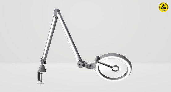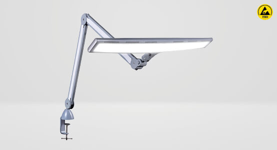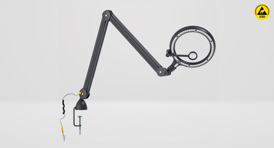 Die DAYLIGHT iQ ESD ist eine vollständig ESD-sichere Lupenleuchte und für den Einsatz in elektrostatisch geschützten Bereichen gemäß IEC 61340-5-1 und ANSI/ESD 20:20 zertifiziert. Sie kombiniert leistungsstarke Tageslicht-LEDs mit 6.000 K für schattenfreie Ausleuchtung und integrierte UV-A-LEDs zur Inspektion von Schutzbeschichtungen sowie zur Prüfung von Löt- und Schweißstellen. Zwei Helligkeitsstufen ermöglichen eine flexible Anpassung an unterschiedliche Aufgaben. Die 17,5 cm große Qualitätsglaslinse bietet eine Vergrößerung von 3 Dioptrien, ergänzt durch eine zusätzliche Schwingarmlinse mit 12 Dioptrien. Robuste Kohlefaserkomponenten sorgen für hohe Stabilität und Langlebigkeit.