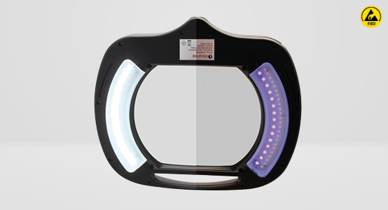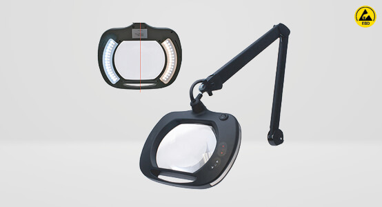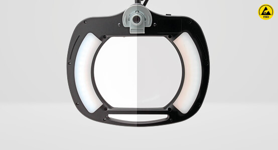 Die LED-Lupenleuchten von Ideal-tek verbinden modernes Design mit einer ESD-sicheren Beschichtung zum Schutz empfindlicher elektronischer Bauteile. Die großzügige Linse mit 190 × 158 mm und 5 Dioptrien bietet ein großes, klares und verzerrungsfreies Sichtfeld. Durch die gleichmäßige Beleuchtung wird die Augenbelastung deutlich reduziert und die Effizienz bei Inspektionsarbeiten gesteigert. Der federausgeglichene Arm lässt sich um 360 Grad schwenken und flexibel positionieren. Eine geschützte Armkonstruktion verhindert dabei zuverlässig das Einklemmen der Finger. Die Helligkeit wird komfortabel über einen berührungsempfindlichen Dimmer gesteuert und ermöglicht eine 2,25-fache Vergrößerung.